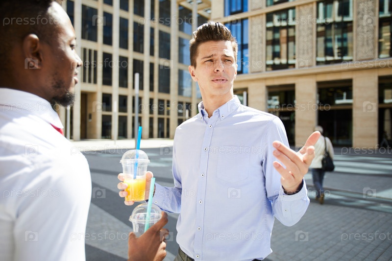 Удивленный бизнесмен разговаривает с коллегой во время перерыва