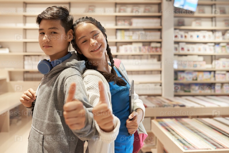 Учащиеся стоят в библиотеке с поднятыми большими пальцами