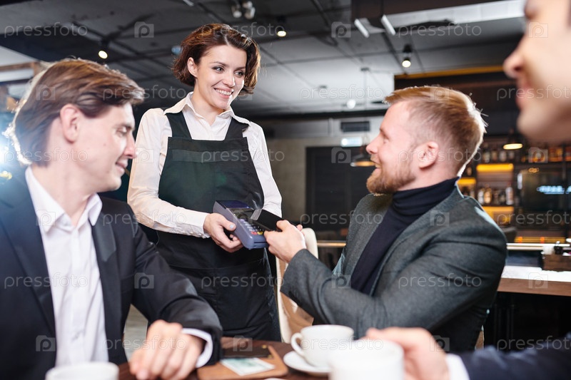 Красивая официантка дает терминал для оплаты бизнесмену