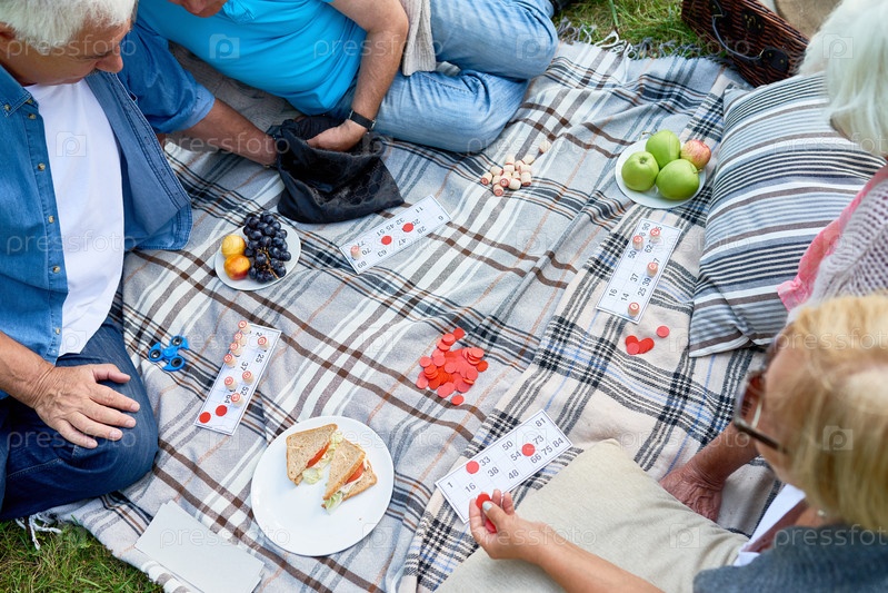 Пожилые люди играют в лотерею в парке