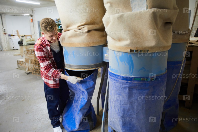 Работник контента собирает пиломатериалы в мешок