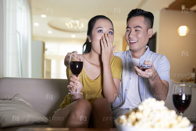 Взволнованная пара с вином смотрит телевизор