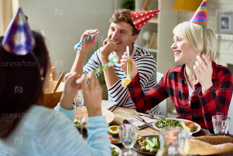 Счастливые пары, празднующие день рождения за обеденным столом