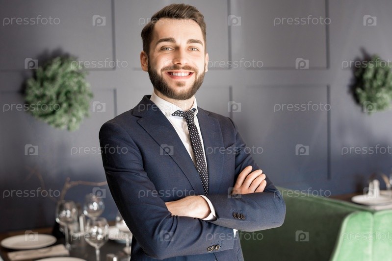 Удовлетворенный красивый бизнесмен, управляющий рестораном