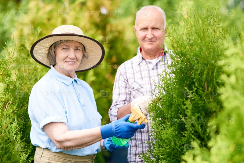 Пожилая пара, работающая в саду счастлива вместе