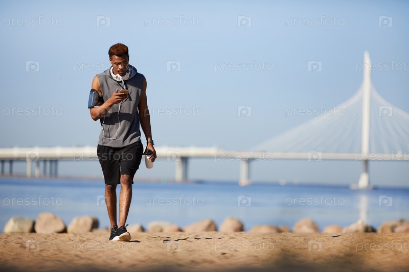 Серьезный чернокожий парень, отправляющий смс-сообщения во время ходьбы по пляжу