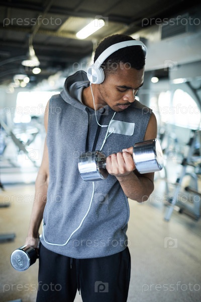 Мужчина тренируется на гантели