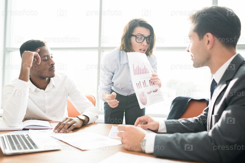 Нервная бизнес-леди показывает финансовые отчеты коллегам