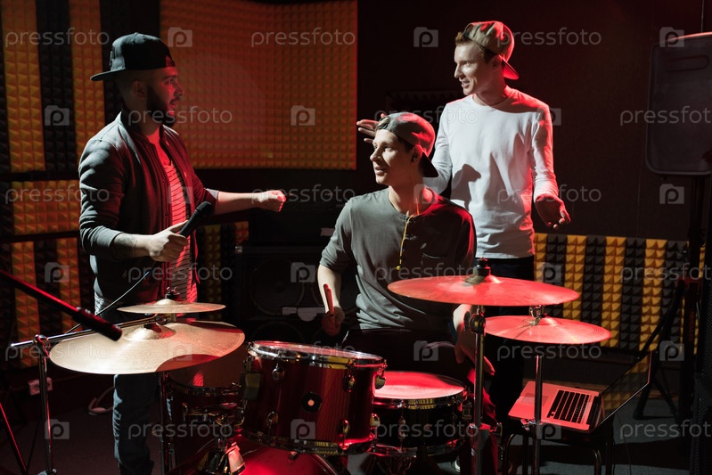 Группа музыкантов в студии звукозаписи 'Гараж'