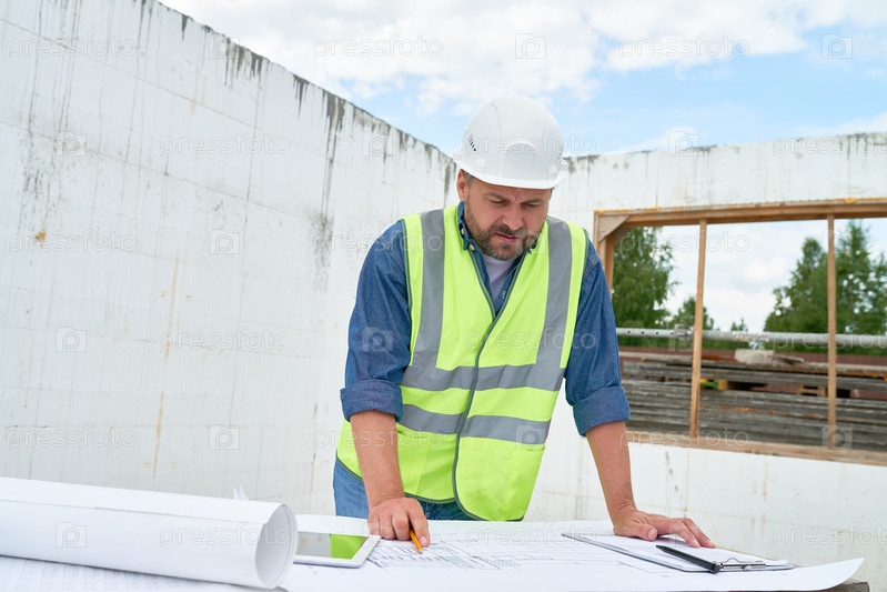 Зрелый строитель смотрит на чертежи этажей на сайте