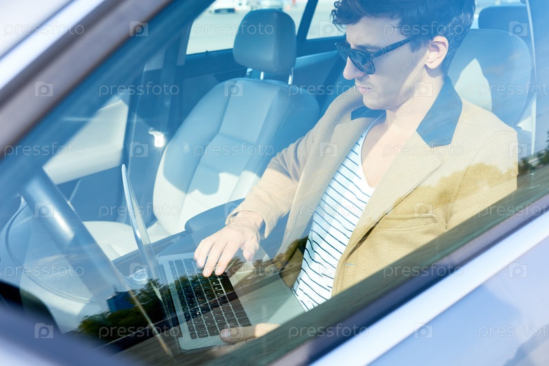 Молодой предприниматель использует ноутбук в машине
