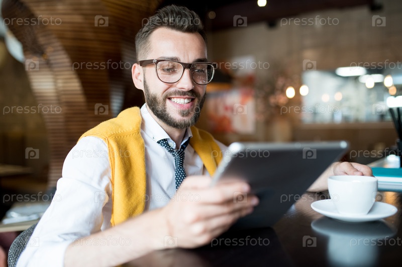 Улыбающийся бизнесмен использует планшет