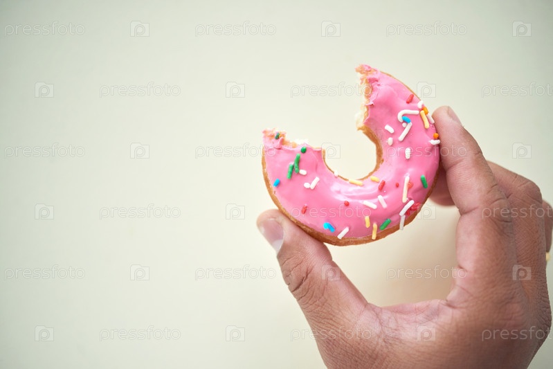 Руки, держащие пончик с вырванным укусом