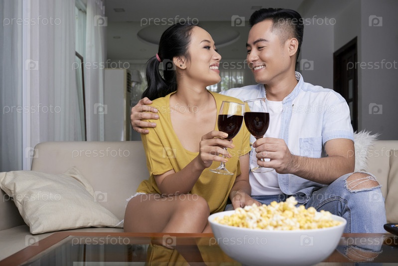 Романтическая пара с попкорнами и вином
