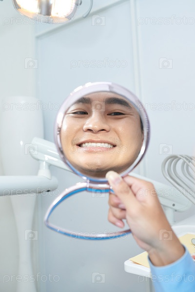Улыбающийся азиатский мужчина наслаждается зубами в зеркальном отражении