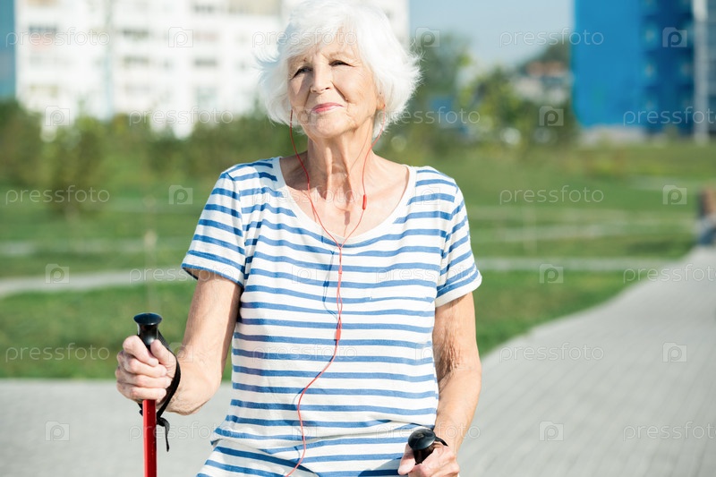 Современный сеньор Женщина наслаждается скандинавской ходьбой