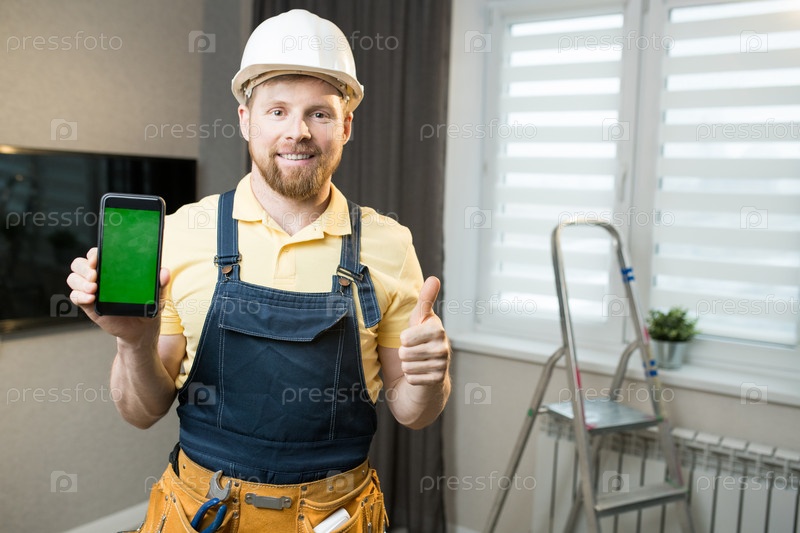 Улыбающийся парень с ремнем инструмента, держащий смартфон