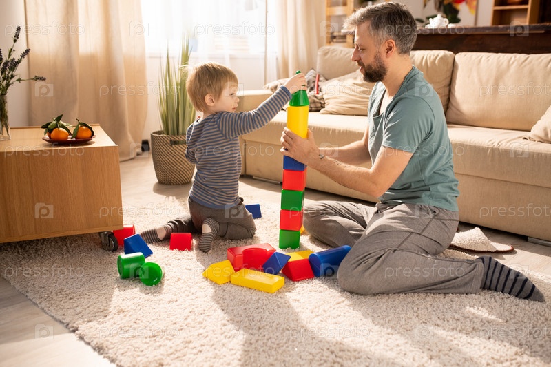 Сын играет кубиками игрушек