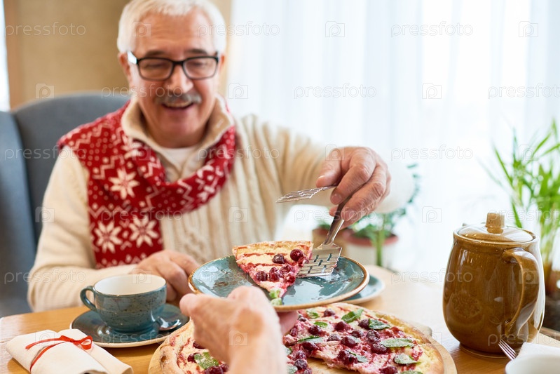 Старший мужчина ест сладкий пирог на рождественском обеде
