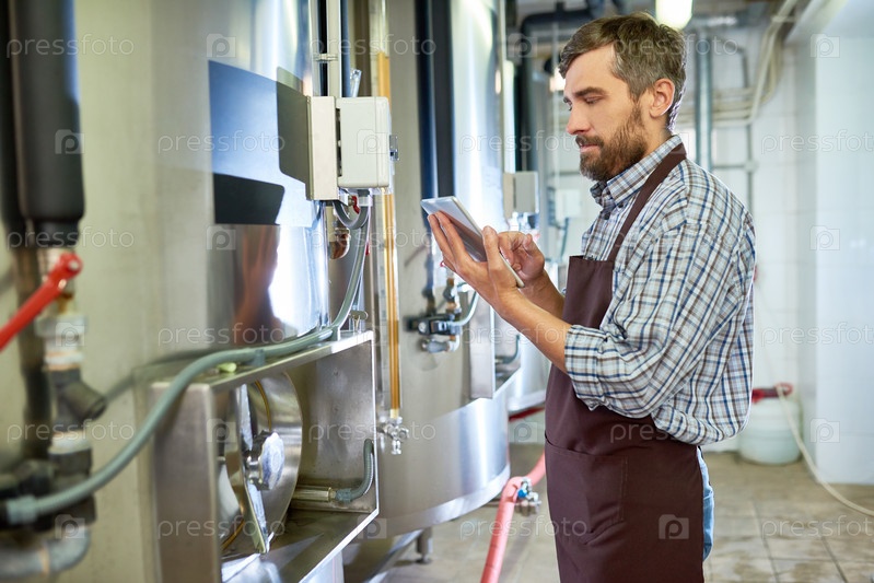 Концентрированный инженер пива, использующий планшет во время осмотра оборудования