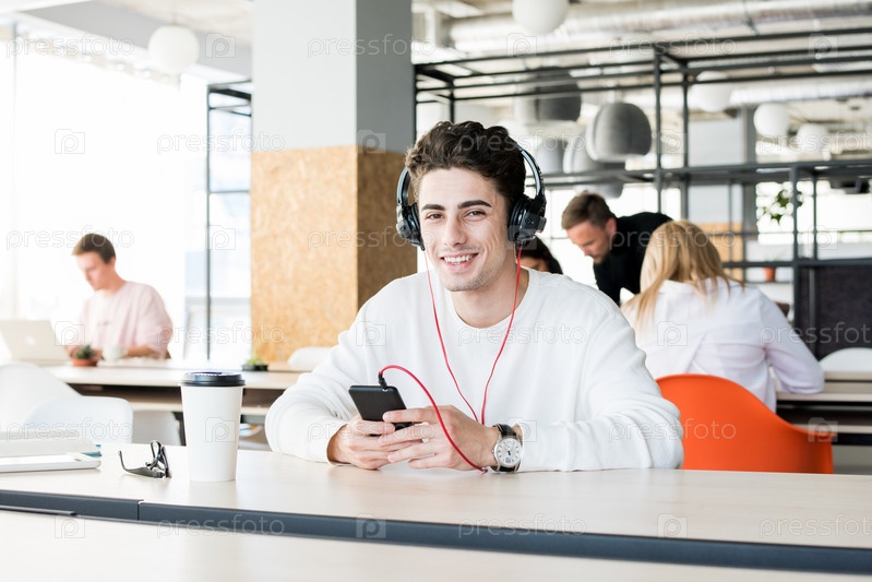 Позитивный молодой студент, слушающий музыку в наушниках
