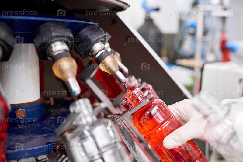 Фабричный работник берет полную бутылку из заполнительной машины