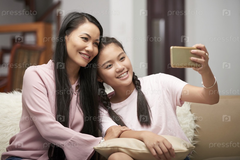 Взрослая женщина с дочерью-подростком делает селфи