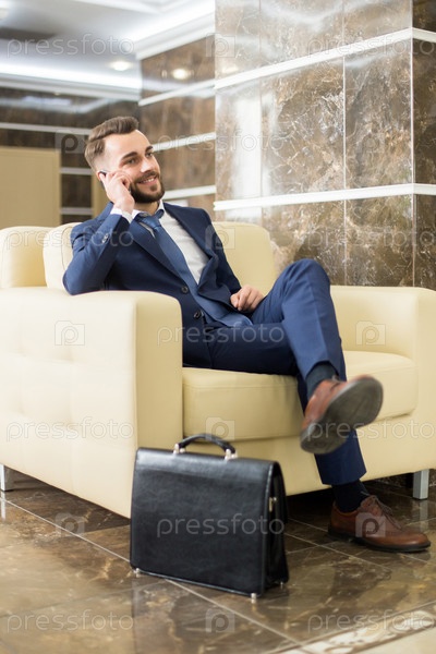 Красивый бизнесмен разговаривает по телефону в вестибюле