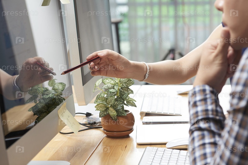Коллеги анализируют данные на экране компьютера