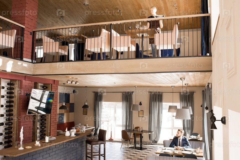 Современный комфортабельный ресторан с клиентом и официанткой