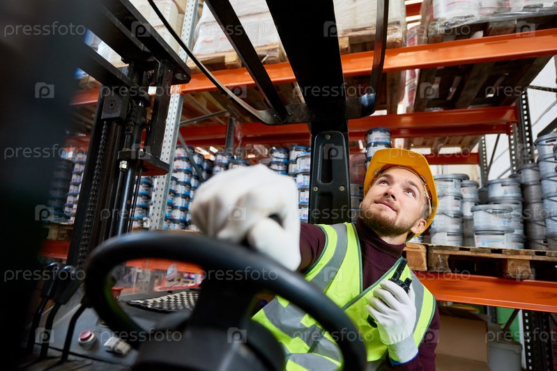 Работник склада, перемещающий товары с помощью вилочной погрузки