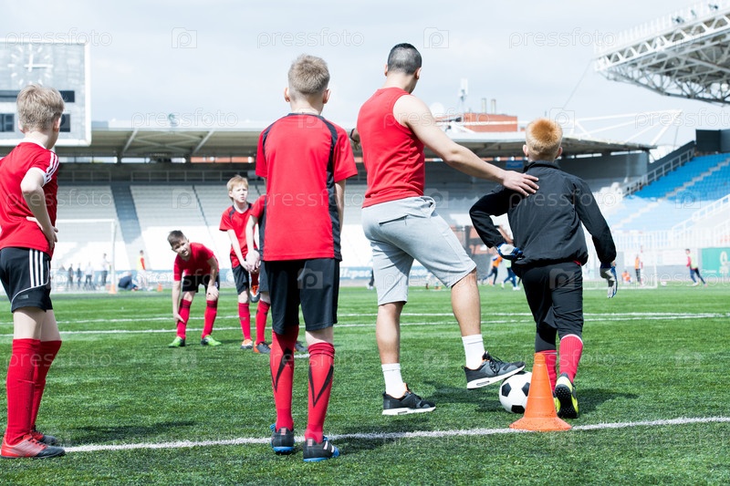 Мальчики играют в футбол на стадионе