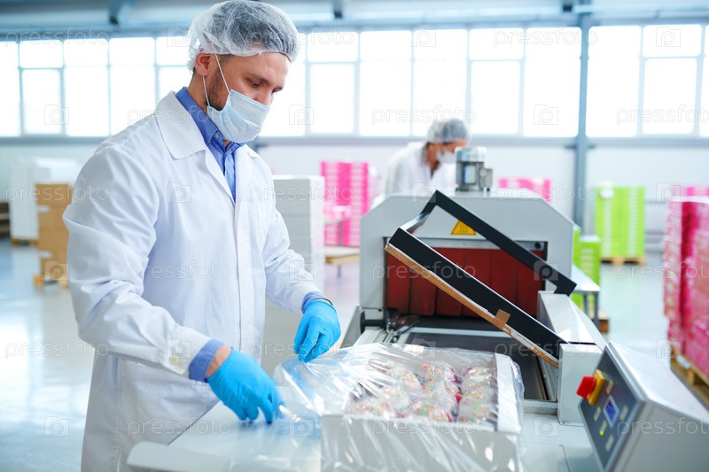 Работник фабрики кондитерских изделий упаковывает коробку в упаковочную пленку
