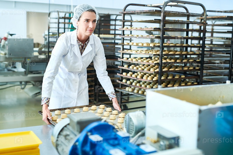 Сотрудник фабрики кондитерских изделий держит поднос с сырой выпечкой