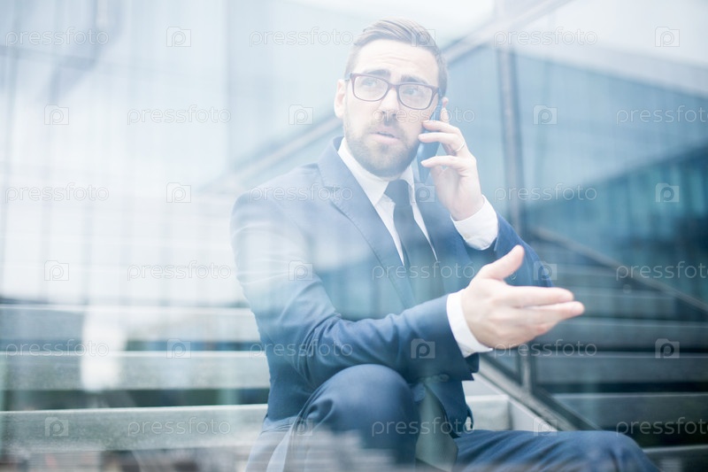 Бизнесмен сидит на ступеньках и разговаривает со смартфоном