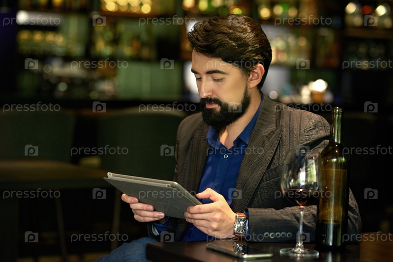 Мужчина отдыхает с бутылкой вина в баре