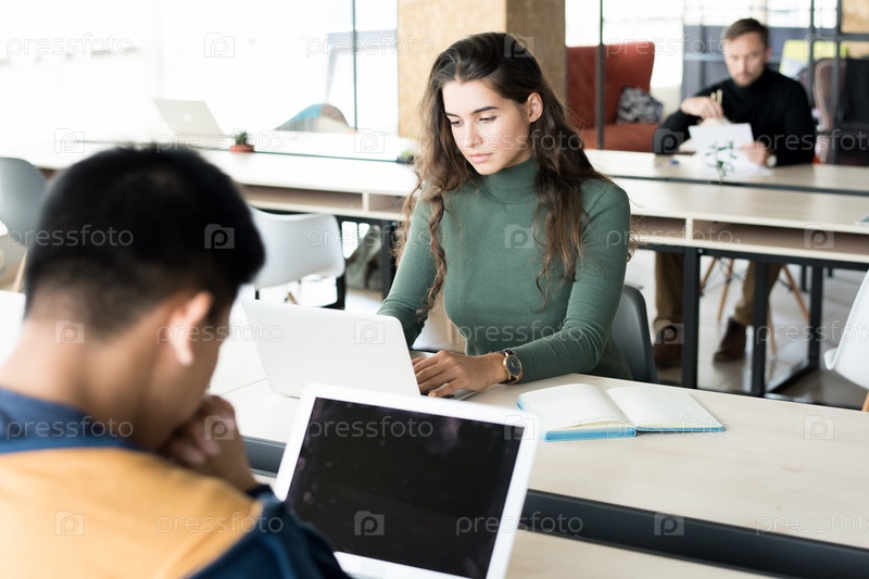 Вдумчивая леди работает над маркетинговым проектом в офисе с открытым пространством