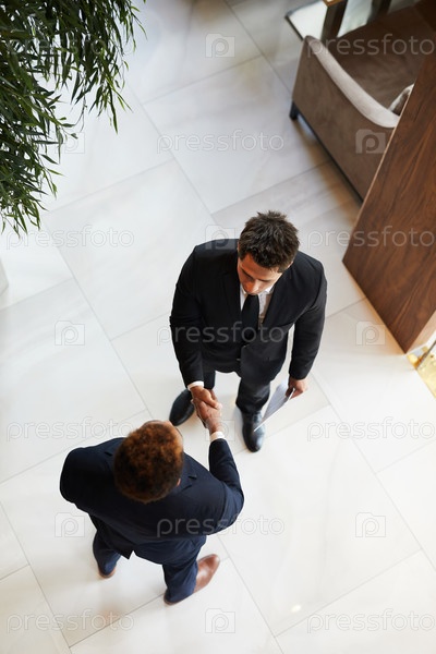 Уверенные предприниматели делают рукопожатие в вестибюле