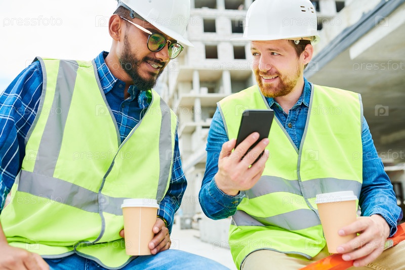 Инженер показывает коллеге свой смартфон во время перерыва