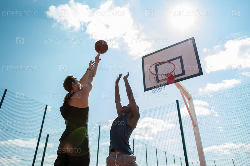 Два молодых человека играют в баскетбол на свежем воздухе