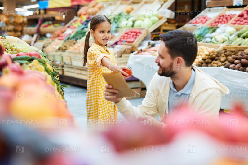 Красивая девочка дарит папе помидоры на фермерском рынке