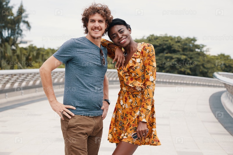 Стильная мультиэтническая пара, стоящая на пешеходном мосту
