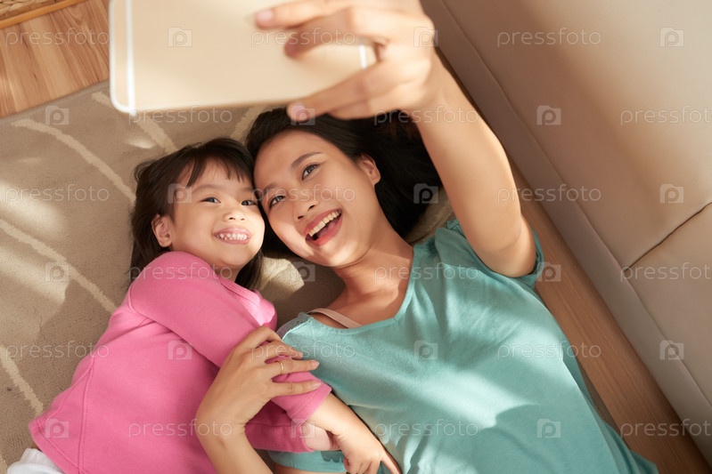 Счастливая женщина делает селфи с дочерью