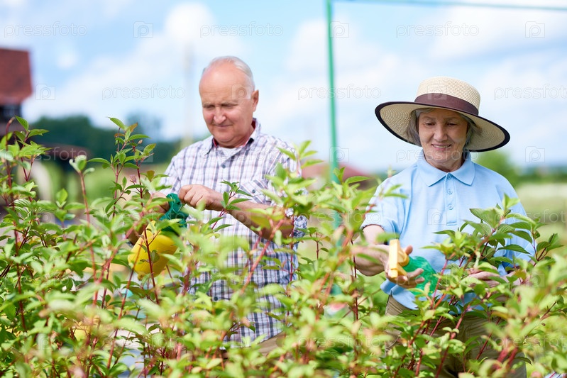 Пара старших фермеров, работающих в саду