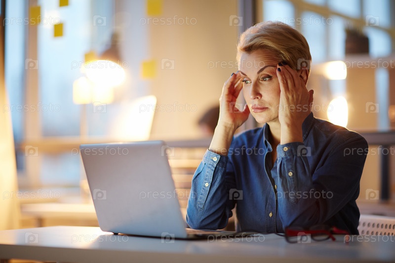 Уставшая деловая женщина, работающая допоздна