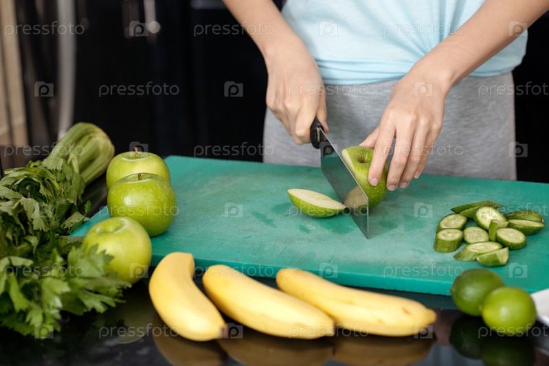 Женщина с урожаем режет яблоко