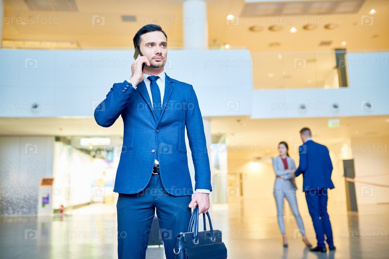 Красивый бизнесмен разговаривает по телефону в аэропорту