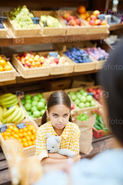 Недовольный ребенок смотрит на родителя в магазине органических продуктов