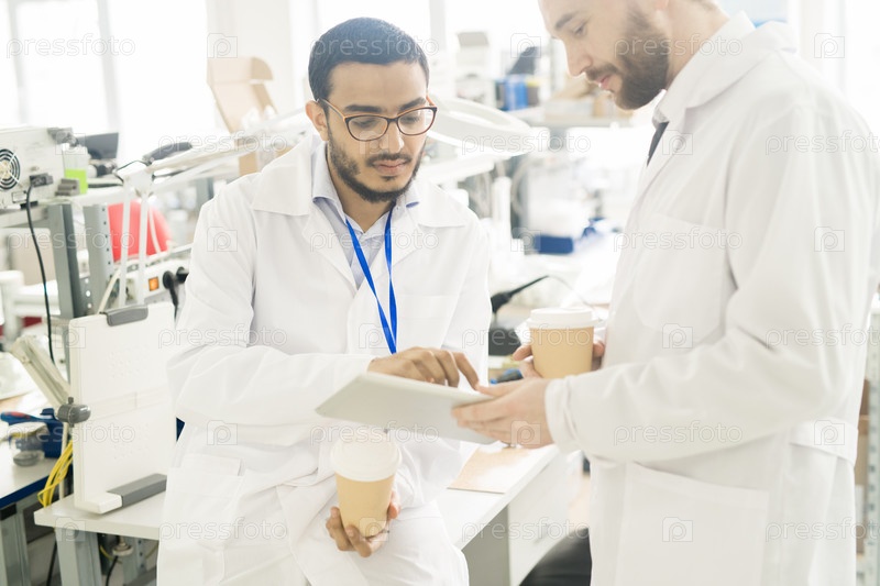 Серьезные инженеры анализируют данные на планшете