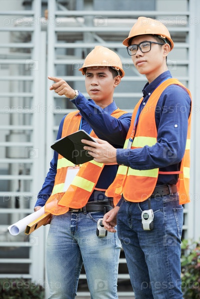 Азиатские инженеры смотрят издалека на стройплощадке